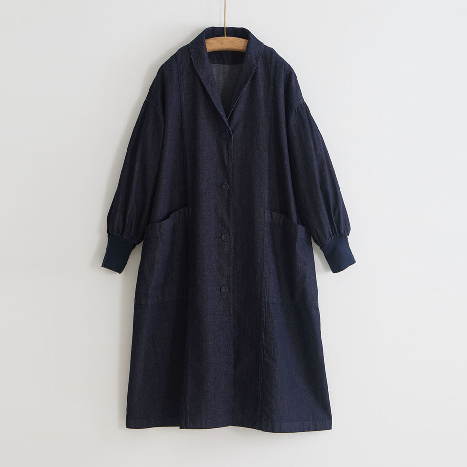 今季は、長年の定番素材ツイル二重織に加えて、待望のデニムが登場。着込むほどに生じるアタリやスレも素敵に見えるところが、ワークワンピースにぴったりです。どちらの生地も、ほどよい厚みがありつつやわらかで、すっぽり身を包んでくれる安心感は格別。そして「ちょっとそこまで」のお出かけには、ストールやブローチでおめかしを。きっと「毎日がワークワンピース日和」になるはずです。