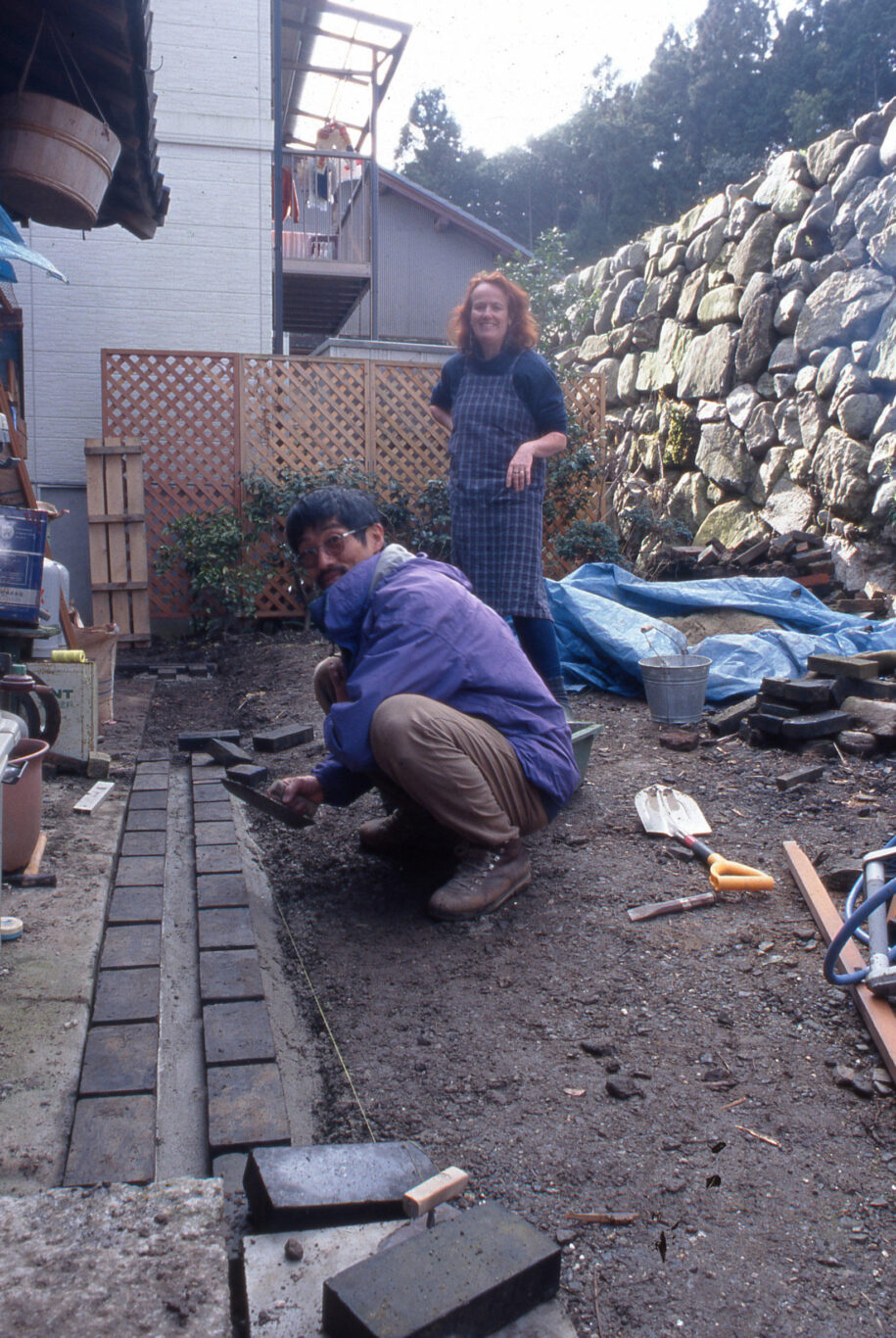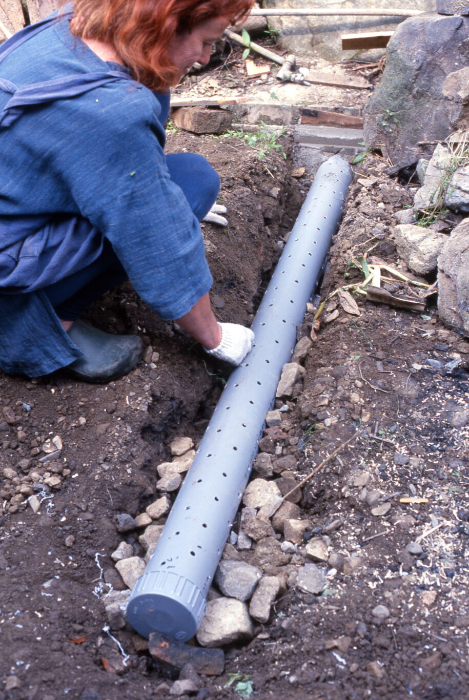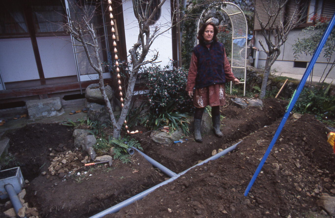 また、庭の水はけがよくなるように、ドリルで1センチぐらいの穴をたくさん開けた塩ビパイプを庭のあちこちに埋めた。パイプの先は、庭の周囲の石垣の石の継ぎ目や側溝に突き出した。こうして作った排水設備の成果は予想以上で、庭が池になることはなくなった。