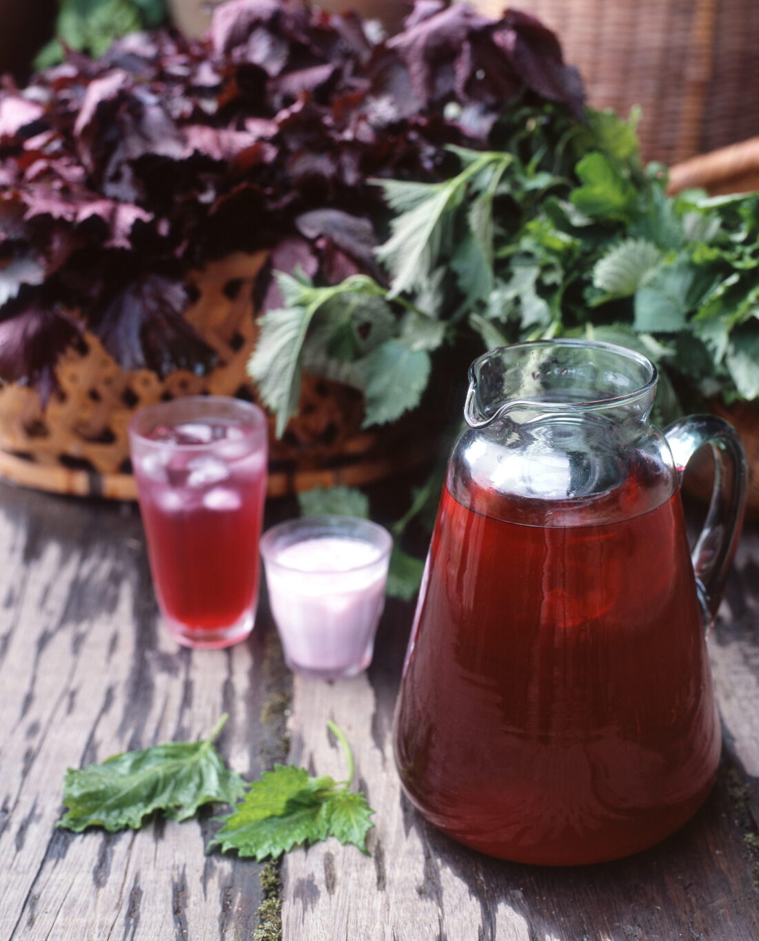 紫蘇ジュースで赤紫蘇と青紫蘇の2種類を混ぜるわけは、赤紫蘇よりも青紫蘇の方が味と香りが強いから。とはいえ、青紫蘇だけだと色が良くないので赤も欲しい。
