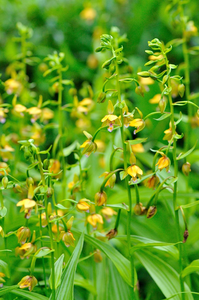 カキランも同じく湿地性の野生ラン。柿の実の色に似た黄褐色の花を茎の先に10ほど総状に付ける。こちらは派手に群生しているので、もの静かな乙女のようなトキソウと違い、賑やかな村祭りの若者たちのようだ。