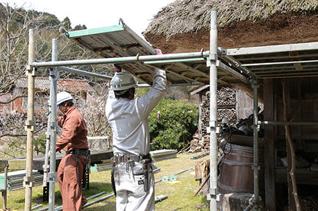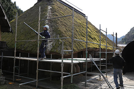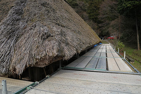 午後2時過ぎ、見る見る間に足場は組み立てられていき、午後4時には組み上がっていました。足場に登ってみるといつも見ることのない景色と茅葺き屋根を間近で見ることができ、ところどころに開いた穴らしきものや茅がもう朽ちているのを見つけました。