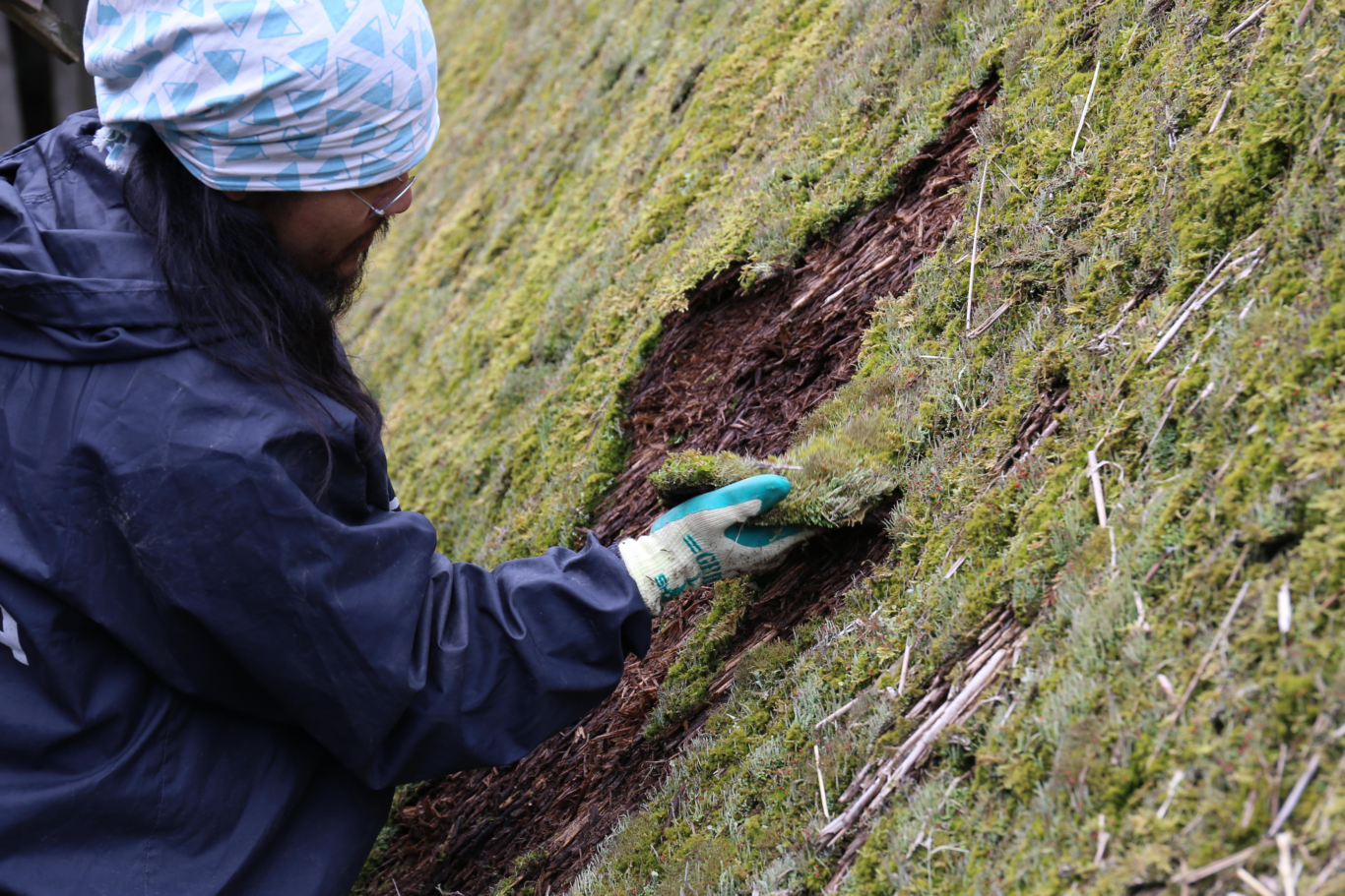 足場ができて早速、屋根の苔をとる作業が始まりました。乾いた苔はぼろぼろに崩れてしまうので、主に屋根の北側と東側のふかふかした部分を丁寧にとって確保しておきます。