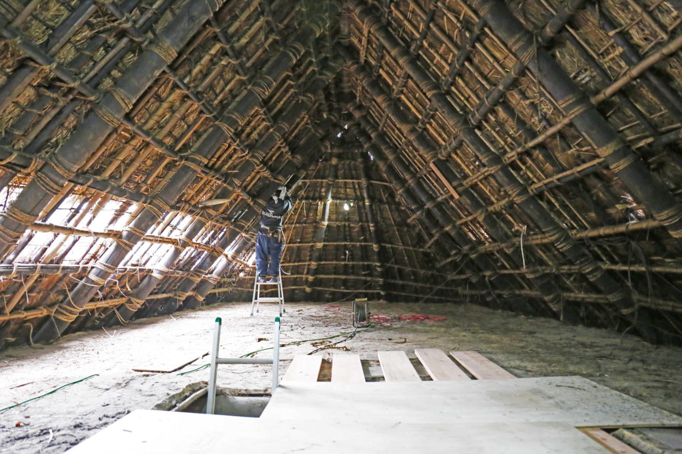 日曜日に顔を出してみると、もう茅がなくなり中が見えている部分ができていました。屋根裏部分に登ってみると構造が間近に見えてダイナミックです。初めて上に上がりましたが、なかなかこんな機会はないのでワクワクします。床部分が土で塗られているのも初めて知って驚きでした。
