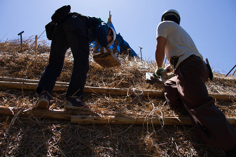 作業地点は日に日に高くなっていきます。一層を葺くのにかかる時間が短くなっているように思い、職人さんに尋ねてみると、上部ほど屋根がすぼまっていくので茅を葺く面積的には小さくなっていくからですかね、とのことでした。