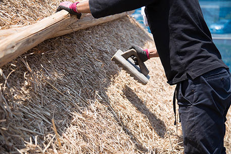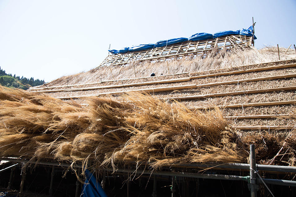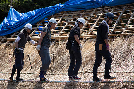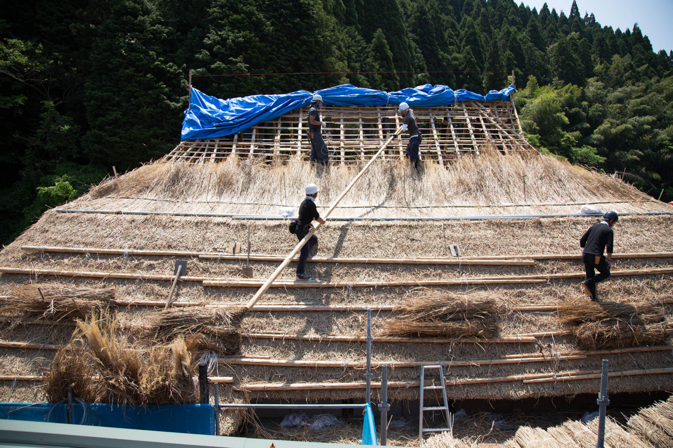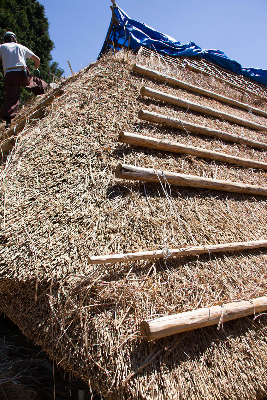 茅の層は、さらにさらに厚くなり、とうとうカメラのフレームに収まらなくなってきました!日差しの強さが増す中、平を葺く作業は続きます。