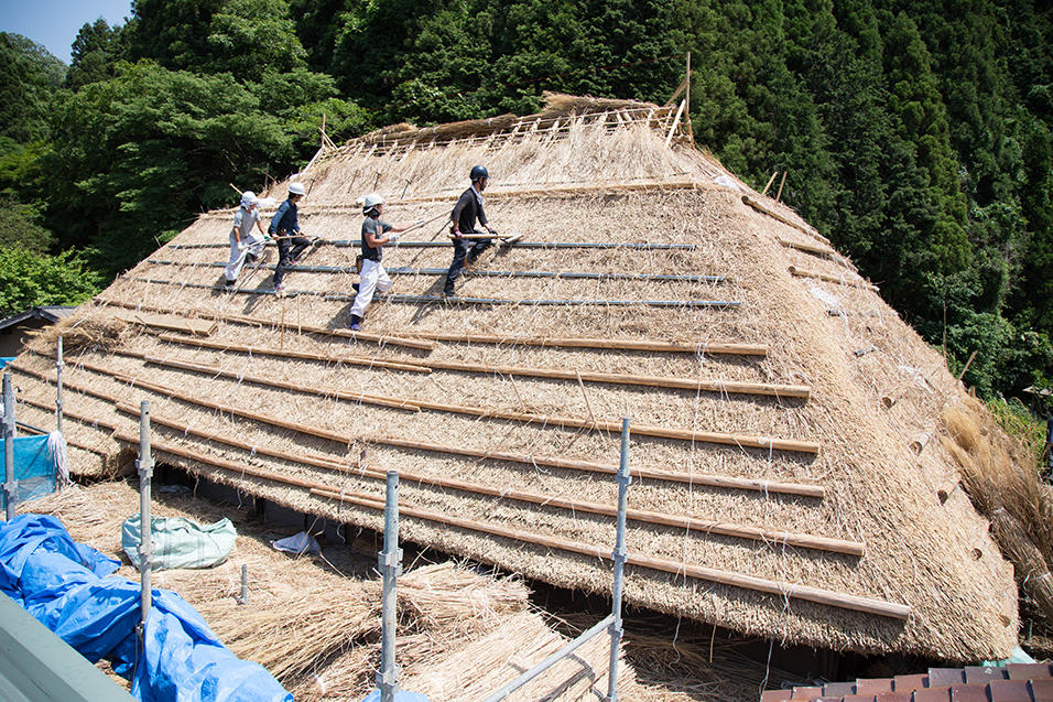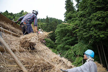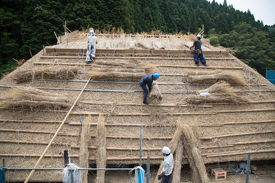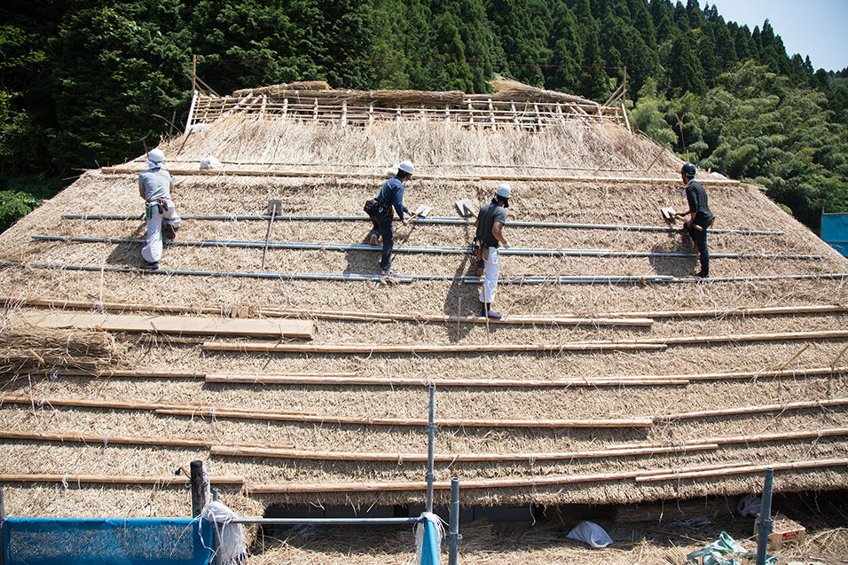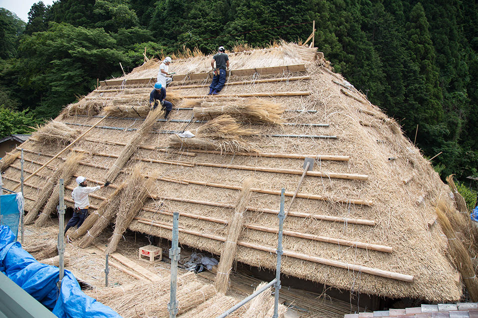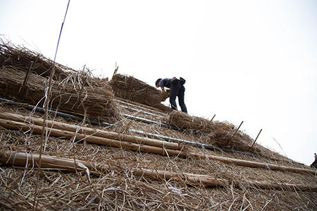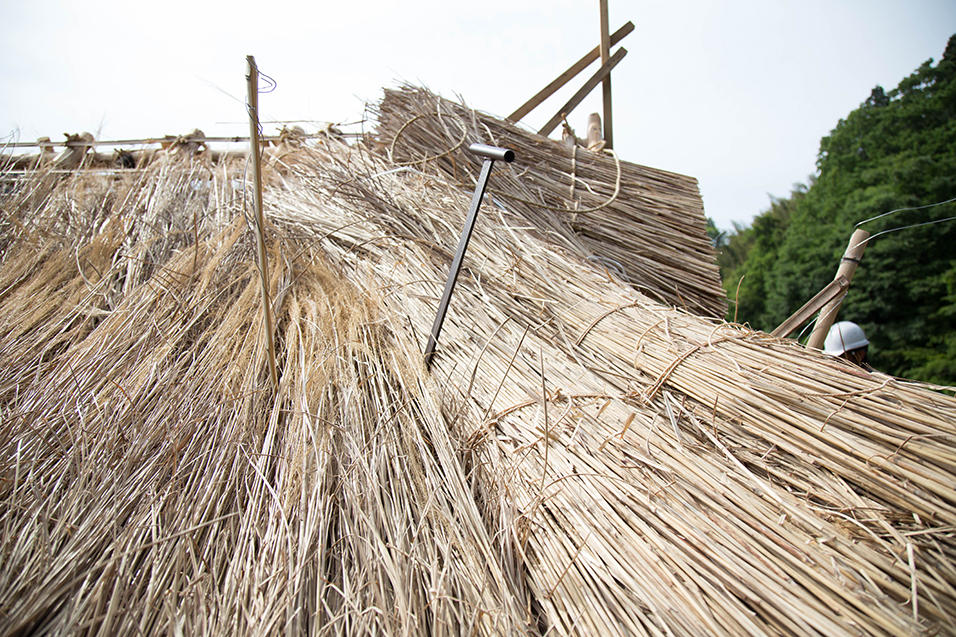 棟の土台となる部分にどんどん茅が葺かれていきます。現場は茅でいっぱいで、屋根の途中に置き場が設けれられ、足場から放り投げては受け取り、またその上の茅葺き現場へ上げられていきます。