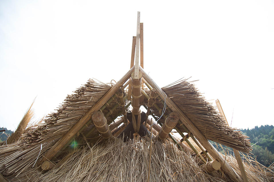 カメラのフレームには、いつも棟が入るようになり、地面ははるか下となりました。地上から約10メートルの高さにいます。棟の形について話し合いが始まっています。棟まであと6層ほどとのことですが、葺く茅の長さや処理の仕方を相談しながら進めています。