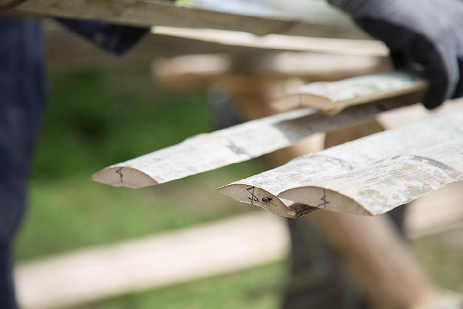 この日は、驚いて目を見張る作業がありました。いつも、すごい!という思いで作業を見ているのですが、昨日から仕込んであった杉皮を加工し終え、「品軒(しなのき)」にかぶせるために、屋根上に運ぶ様子には圧倒されます。新人職人池田さんと佐藤さんが、下から踏ん張って運びます。