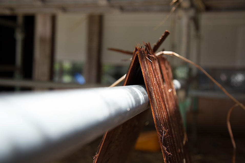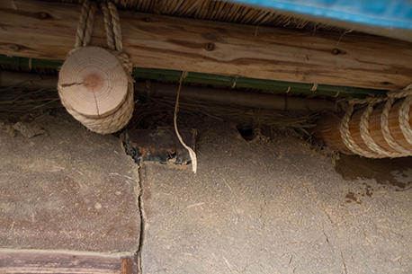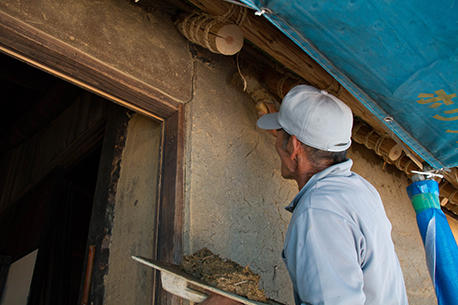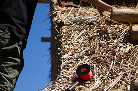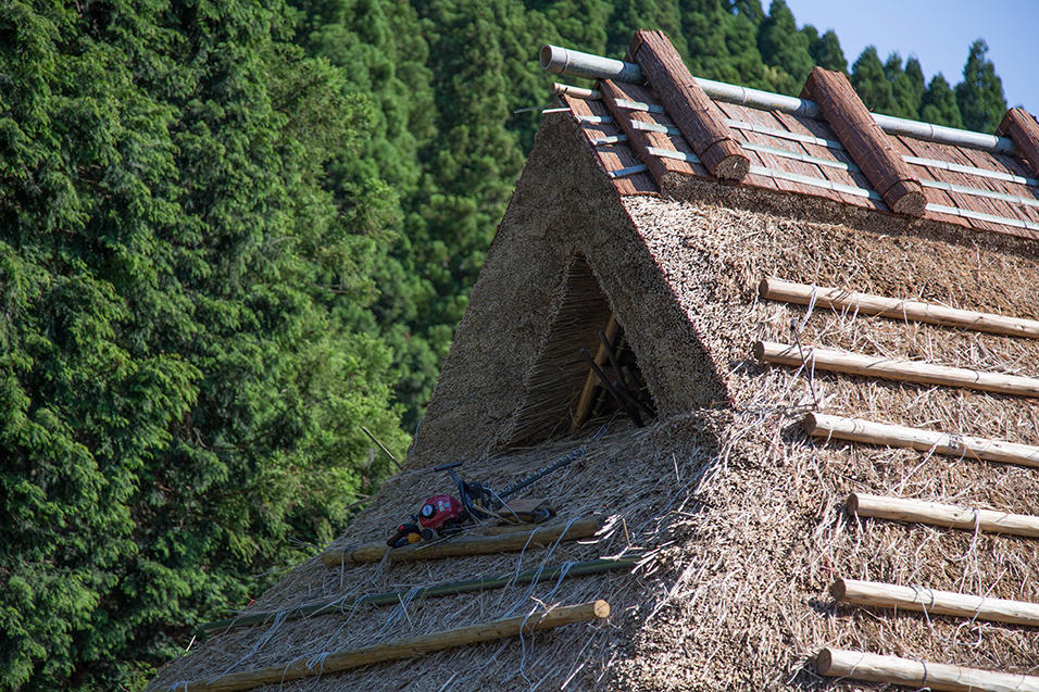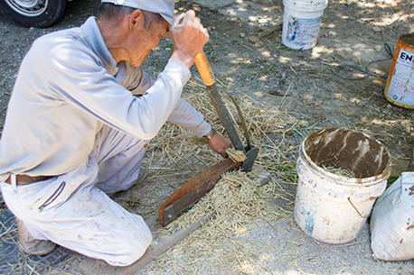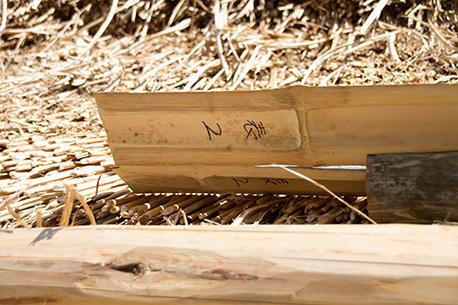 お天気に恵まれています。昨日置き終えた「針目覆い」を杉皮でくるんでいきます。また、破風を刈り整え、棟の顔をつくります。一方、下では、何やら落ちた藁を集めて細かく断裁しているおじさんがいます。尋ねると、土壁の補修用に「ドロ」をつくっているとのこと。古い垂木を取り除いた時にできた土壁の凹みを埋めるそうです。