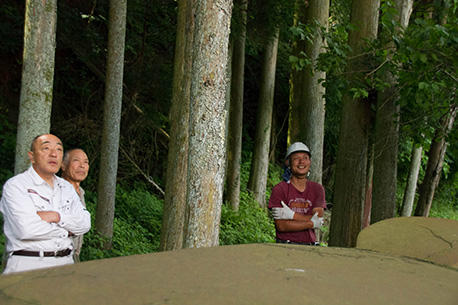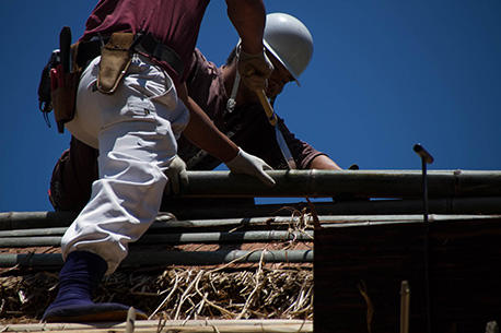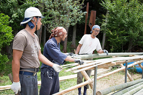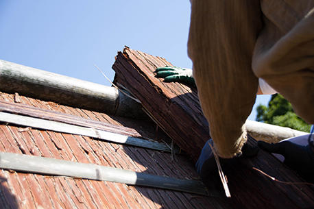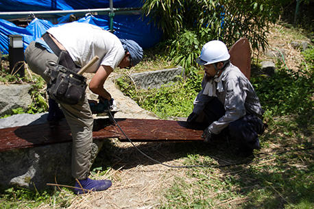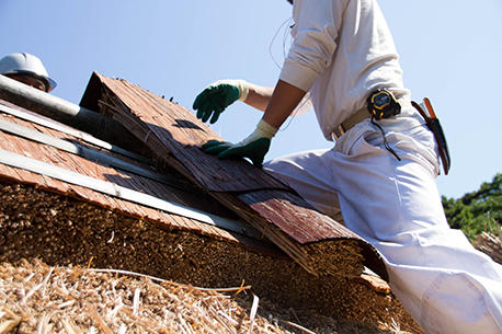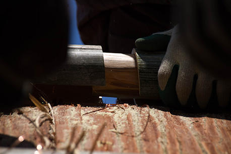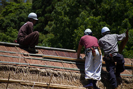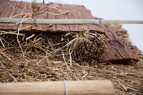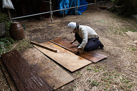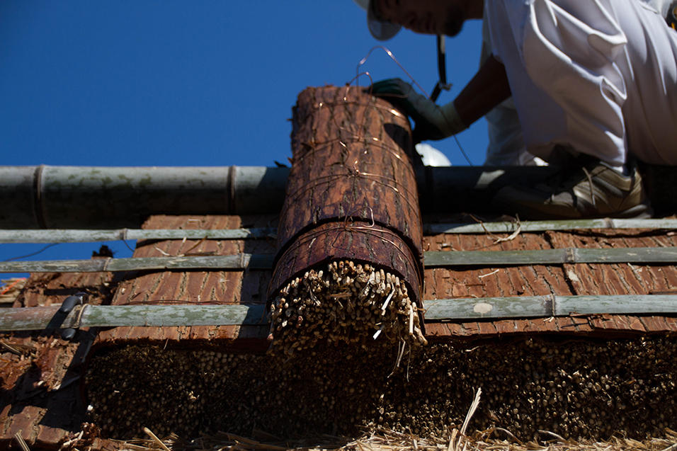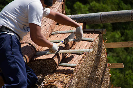 一枚一枚を少しずつ重なり合うように覆っていきます。きれいに覆い終わった後、多めに用意していた杉皮は屋根途中に残り、また、それを根気強く下へ降ろすという作業が続きました。