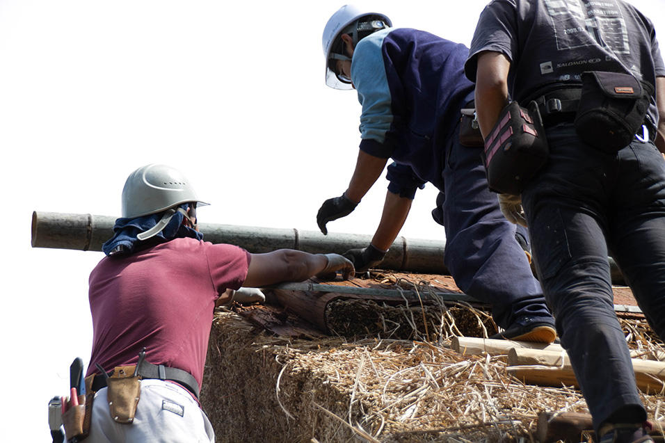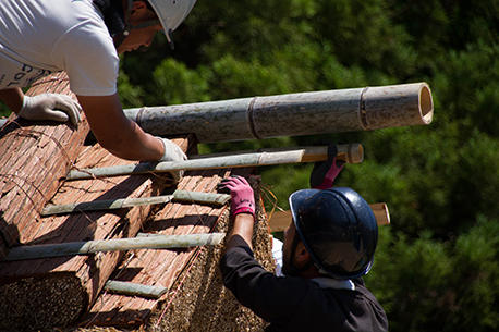 重要な作業が続いています。昨日覆った杉皮を、きれいに切り出した青竹で抑えていきます。2本の長い竹を継ぎ、「品軒」の両側に3本を渡します。表から見える部分なので、3本の間隔を同じにするよう、品軒の土台として葺いた茅を締めている押さえ竹の位置を再調整するなど根気強く調整が行われました。がんぶりも2本の真っ直ぐな青竹を継ぎます。その継ぎ目を細工し、見事ぴったりと棟の頂点に据えることができました。