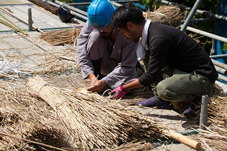 いよいよ棟づくりが始まりました。屋根全体の趣を決める棟がつくられると完成は間近です!どんな棟がつくられるのでしょうか。ワクワクしながら作業を見守ります。