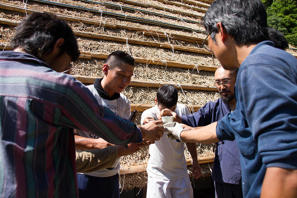 棟の仕上げが完了しました。職人さんたちがヘルメットを脱ぎ、足場に集まります。大将森原さんが日本酒を手に持ち、屋根へ登っていくと後に続いて中腹まで登っていきます。丁寧に時間をかけて整えた棟に、日本酒を端から端までふりかけ、皆でこれからの無事の祈願です!3月下旬の作業開始から、おおよそ3か月間、毎日毎日、根気強くチームワーク良く作業を続けて、とうとうこの日を無事迎えました!皆で祝いの一杯を飲み干しました!