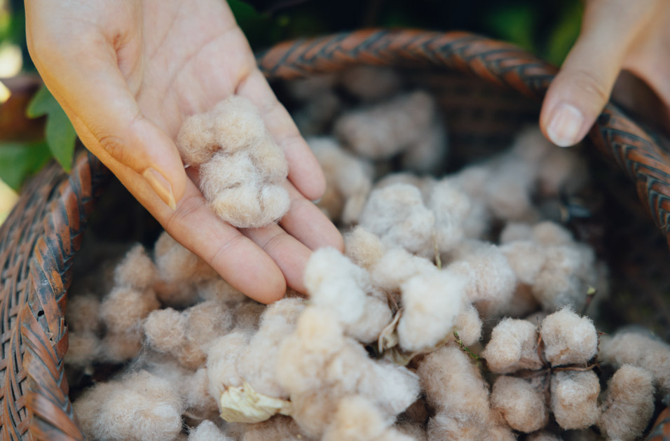 大森の畑で綿を育てる初めてのチャレンジ。無事に実が開き、ふわふわのワタを収穫することができました!60cmほどの背丈に伸びた棉の木。ひとつの株から10個ほどが実り、順繰りに膨らんでいっています。その姿は、茶綿特有の色合いも相まってなんだか小動物のよう。そして触れると温かい!蒼々とした実からふわふわした綿が出てくることがとても不思議です。