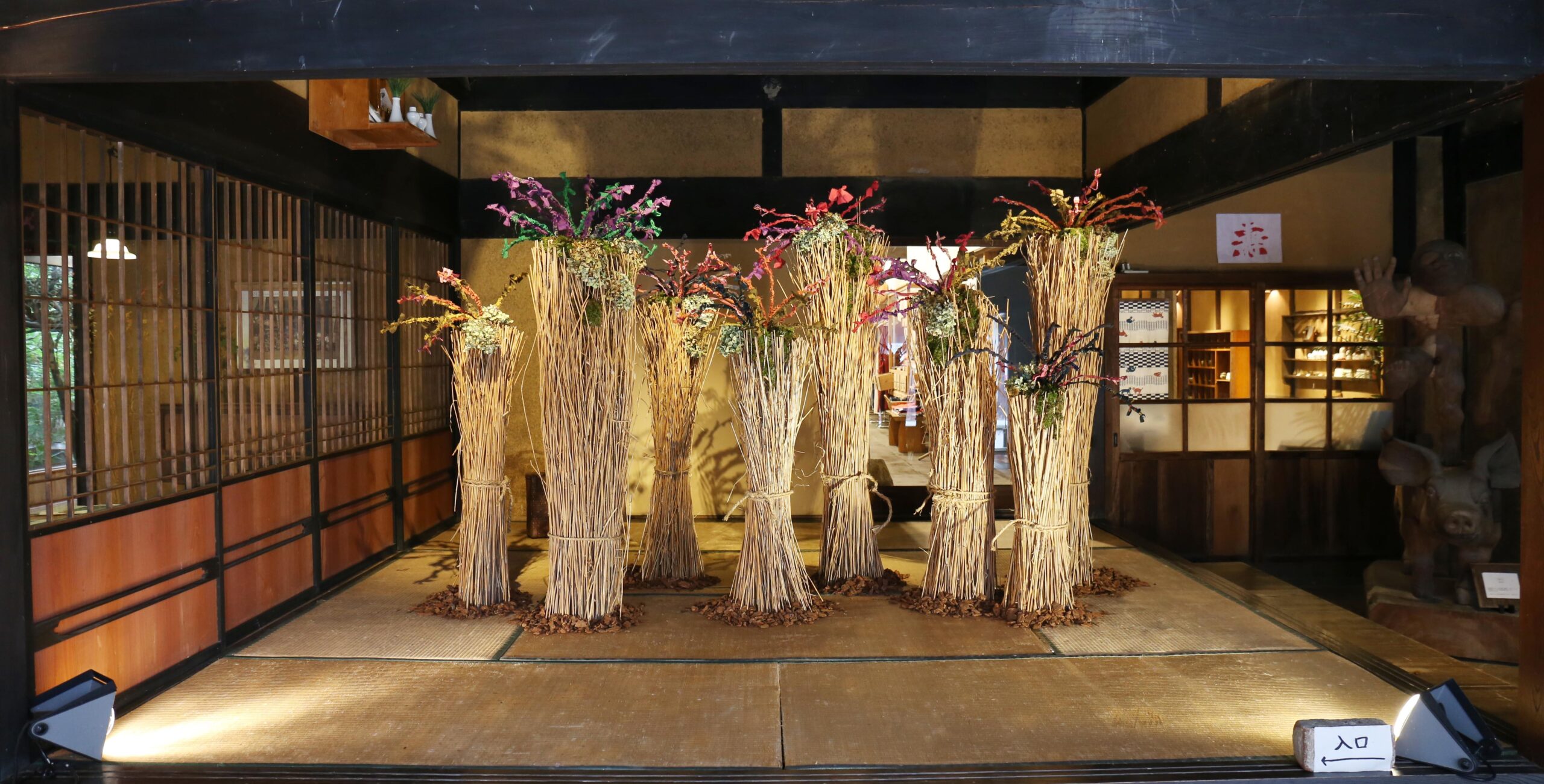 群言堂本店のディスプレイが秋の装いに変わりました!よく見ると鄙舎の屋根についていた苔も使われています。