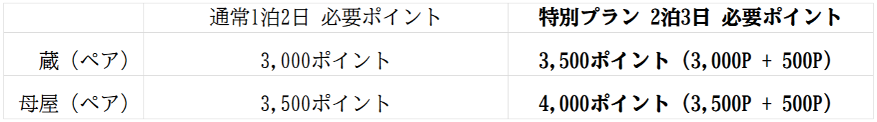 「里山からの贈りもの」の他郷阿部家ペアご宿泊(1泊2日)特典に、追加のポイントをご利用いただくことで、2泊3日のご滞在が可能になります。